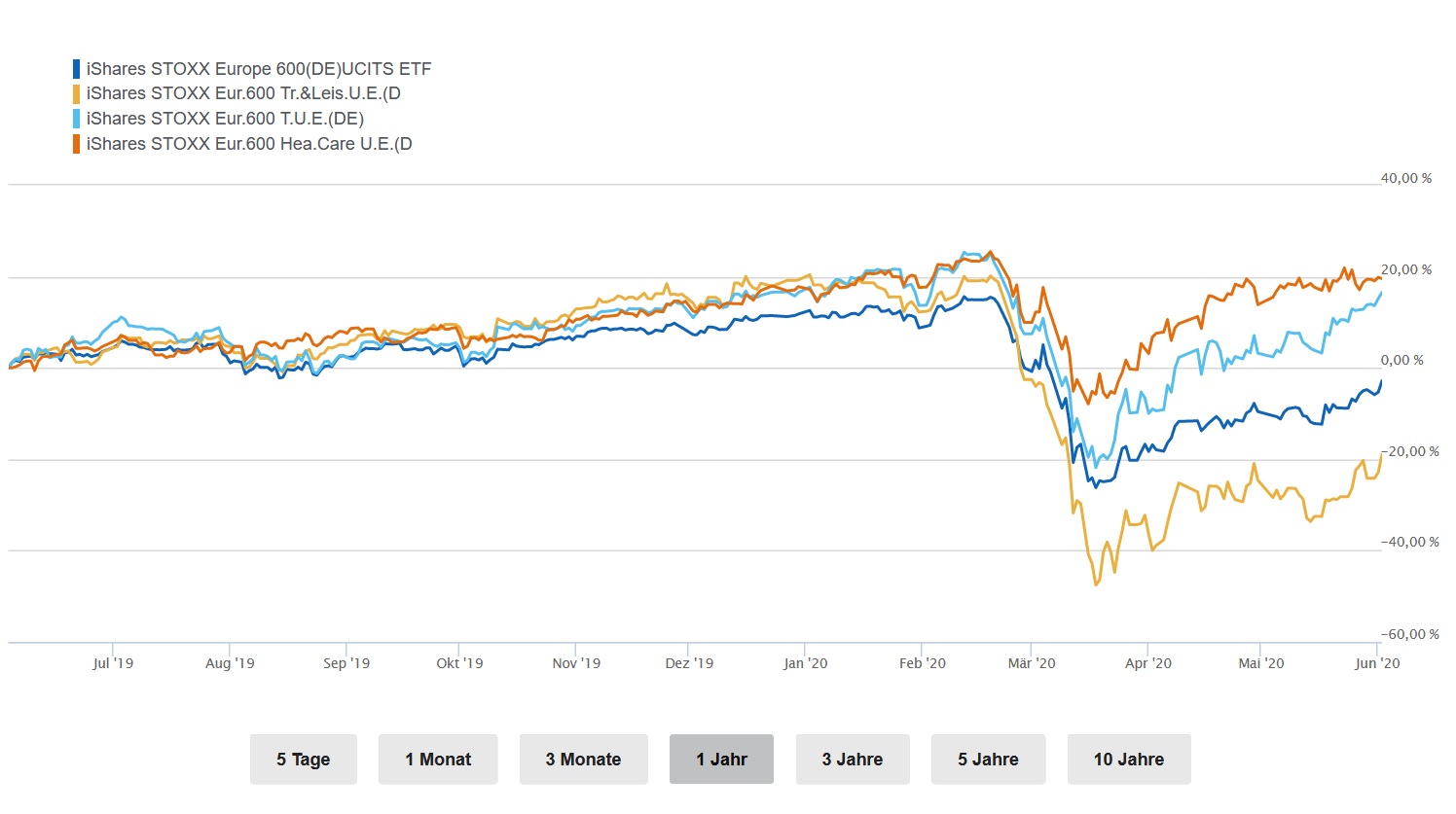 Die Aktienmärkte spiegeln diese Zweiteilung der Wirtschaft in Gewinner und Verlierer bereits wider, wie der folgende Vergleich der Kursentwicklung der Branchenindizes Travel & Leisure, Technology, sowie HealthCare mit dem europäischen Aktienindex STOXX 600 zeigt: