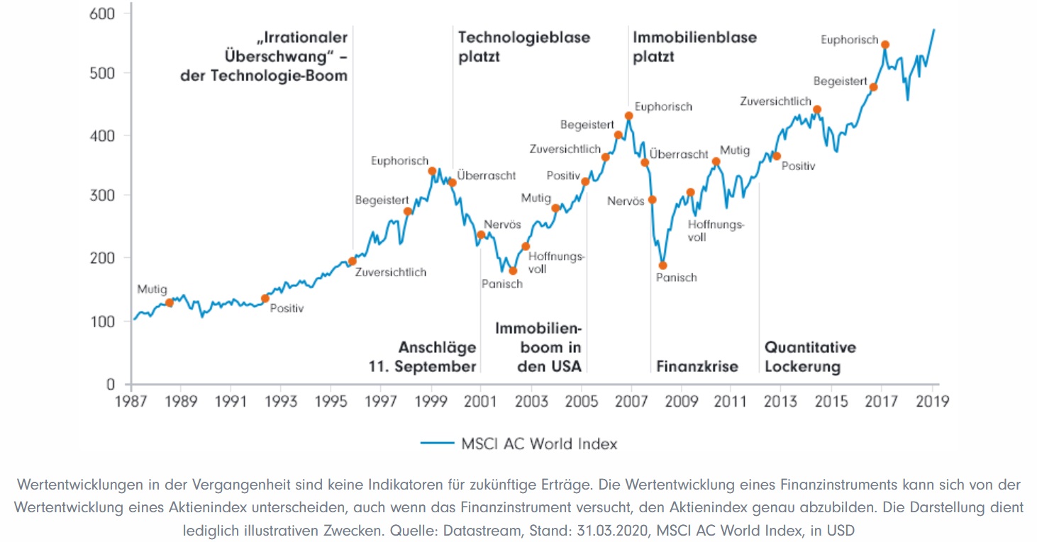 Wer nach dem Platzen der „Dotcom-Blase“ 2000-2002 oder der Finanzkrise 2007-2009 in Aktien investiert hat, freut sich noch heute über seine Entscheidung, wie der Blick auf die Entwicklung des weltweiten Aktienindex MSCI AC World zeigt: