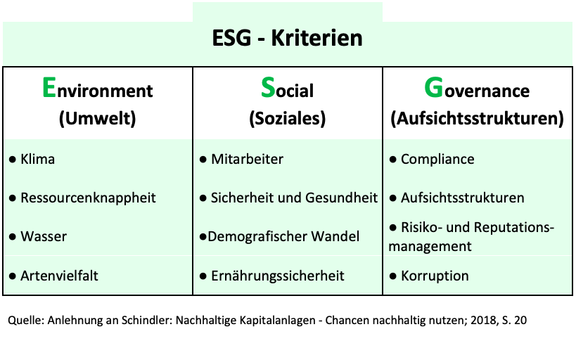 „E“ = Environment steht für Umweltverschmutzung, Treibhausgase oder Energieeffizienzthemen. „S“ = Social beinhaltet Themen wie Gesundheitsschutz oder Arbeitssicherheit. Und unter „G“ = Governance versteht man Themen wie Unternehmenswerte oder Steuerungs- und Kontrollprozesse. Dabei legt man bei den ESG-Kriterien vor allem Wert auf die Förderung von Unternehmen und Branchen sowie positiver sozialer und ökologischer Entwicklungen.