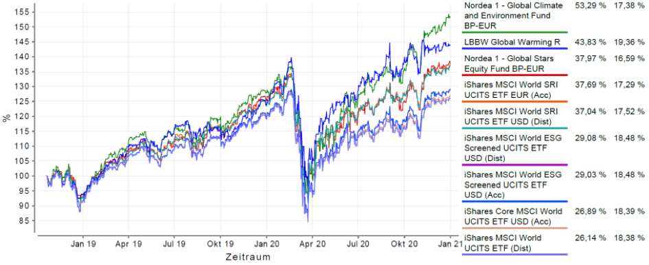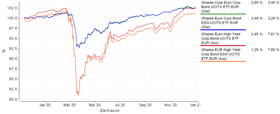 Anm. d. Verf.: Im vorstehenden Vergleich der ETFS-/Fonds wurde der Betrachtungszeitraum 19.10.2018 bis 31.12.2020 gewählt. Dies geschah aufgrund der Tatsache, dass die ESG-Screened ETFs von iShares erst am 19.10.2018 aufgelegt wurden. Die vorstehend getroffenen grundsätzlichen Aussagen gelten jedoch auch für andere, d.h. längere oder kürzere Betrachtungszeiträume.