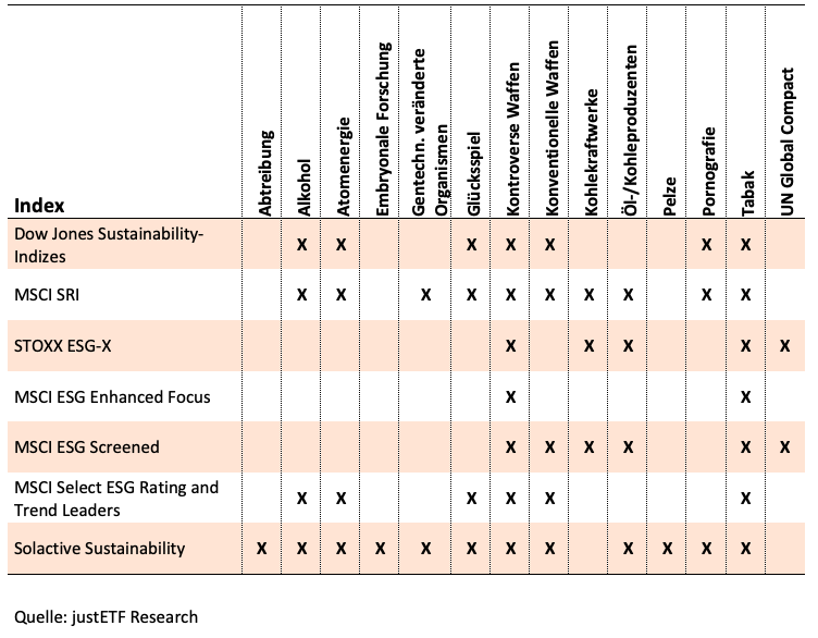 Die „nachhaltige Welt“ ist sehr komplex und so bilden auch die diversen Nachhaltigkeits-Indizes, -ETFs oder -Fonds diverse Nachhaltigkeitskriterien ab, verfolgen verschiedene Anlageziele und nehmen unterschiedliche Ausschlüsse vor, wie die folgende Tabelle der Ausschlusskriterien wichtiger Nachhaltigkeits-Indizes sehr anschaulich darstellt: