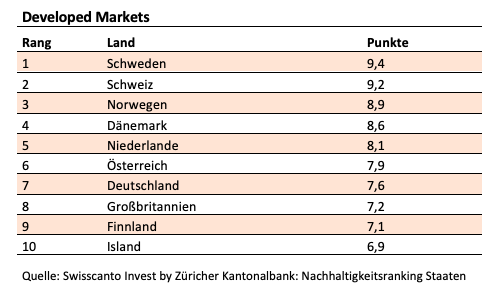 Ein anerkanntes Ranglistenverfahren für staatliche Green Bonds führt die Zürcher Kantonalbank durch. Ökologische, soziale und Governance-Faktoren werden hierbei analysiert und im Rahmen eines Benotungssystems (maximal 10 Punkte) vergleichbar gemacht. Derzeit sieht die Rangliste der Emittenten-Staaten wie folgt aus: