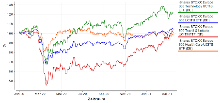Auch die im Herbst 2020 angelaufene zweite Corona-Welle konnte die Aktienmärkte in ihrer Aufwärtsbewegung nicht bremsen. Ein weiterer Aufwärtsschub folgte Anfang November 2020 mit der Zulassung der ersten Corona-Impfstoffe. Insbesondere diejenigen Branchen, die als „Corona-Verlierer“ der Aufwärtsbewegung bis dahin hinterher hinkten – Hotellerie, Gastronomie, Reisen, Unterhaltung, o.ä. – spürten den „Impfstoff-Boost“ am deutlichsten, wie der folgende Vergleich der Kursentwicklung der Branchenindizes Travel & Leisure, Technology und HealthCare mit dem europäischen Aktienindex STOXX 600 eindrucksvoll veranschaulicht: