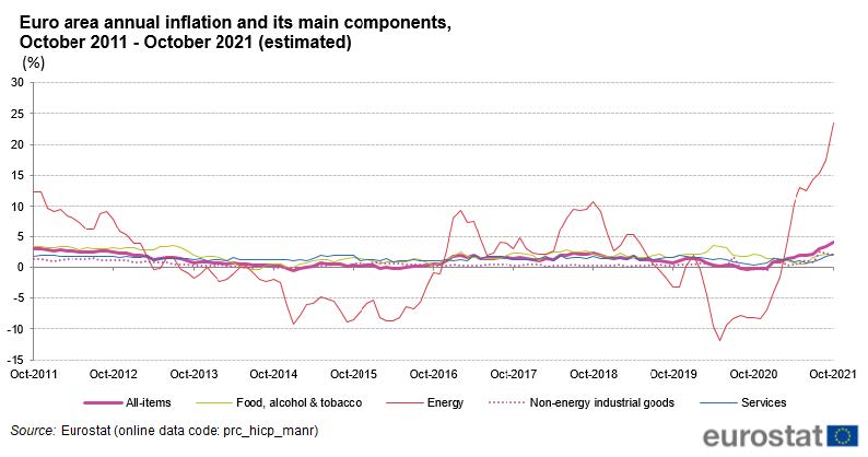 Pikanterweise sind es auch im Jahr 2021 wieder die Energiepreise, die maßgeblich zum Anstieg der Inflationsraten in den letzten Monaten beigetragen haben – wie die folgende Grafik des Statistikamts der Europäischen Union (Eurostat) sehr anschaulich darstellt, die die Entwicklung der Inflationsrate insgesamt sowie einiger wesentlicher Bestandteile derselben in den letzten zehn Jahren ausweist: