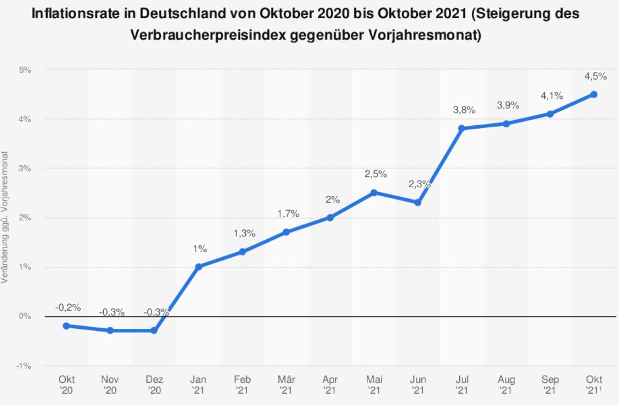 Wie Grafik 2 zeigt, lag die Inflationsrate in Deutschland im Oktober 2020 bei -0,2%, die Preise waren im Vergleich zu Oktober 2019 also leicht gefallen. Zwischen Oktober 2020 und Oktober 2021 wiederum erhöhten sie sich um 4,5%. Mathematisch betrachtet sind die Preise im Durchschnitt der letzten beiden Jahre (von Oktober 2019 bis Oktober 2021) somit um 2,1245% p.a. gestiegen.