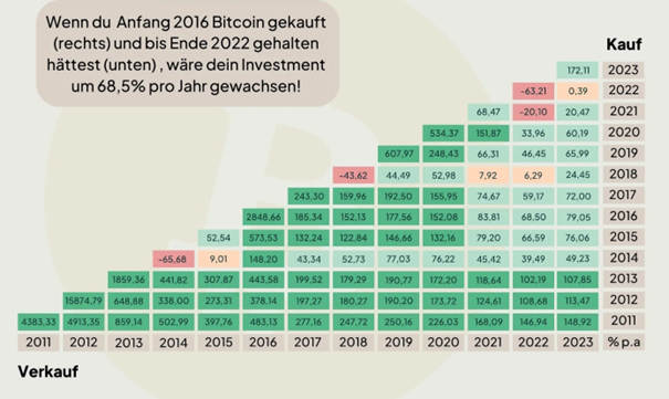 Ein Anleger, der beispielsweise 2016 in Bitcoin investiert hat und diese in 2022 wieder verkauft hat, konnte sich also über einen jährlichen Wertzuwachs von 68,5% erfreuen. In absoluten Zahlen hat der Anleger während dieser Zeit aus 1.000 Eur somit über 38.000 Eur gemacht, ein äußerst erfreuliches Ergebnis. Schauen wir uns die Historie also von Anfang an einmal an.