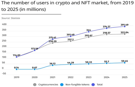 Wie auch immer man das Thema einschätzen mag, an den schlichten Zahlen kommt niemand vorbei: In den letzten Jahren haben sich Kryptowährungen (inkl. NFT) von einem Nischenthema zu einer anerkannten Anlageklasse entwickelt. Ein zentraler Indikator für dieses Wachstum ist die steigende Zahl der Anleger. Laut Statista stieg die Anzahl der Besitzer von Kryptowährungen von 114 Millionen in 2019 auf über 391 Millionen Anfang 2025, was einem Anstieg von 342 % entspricht:
