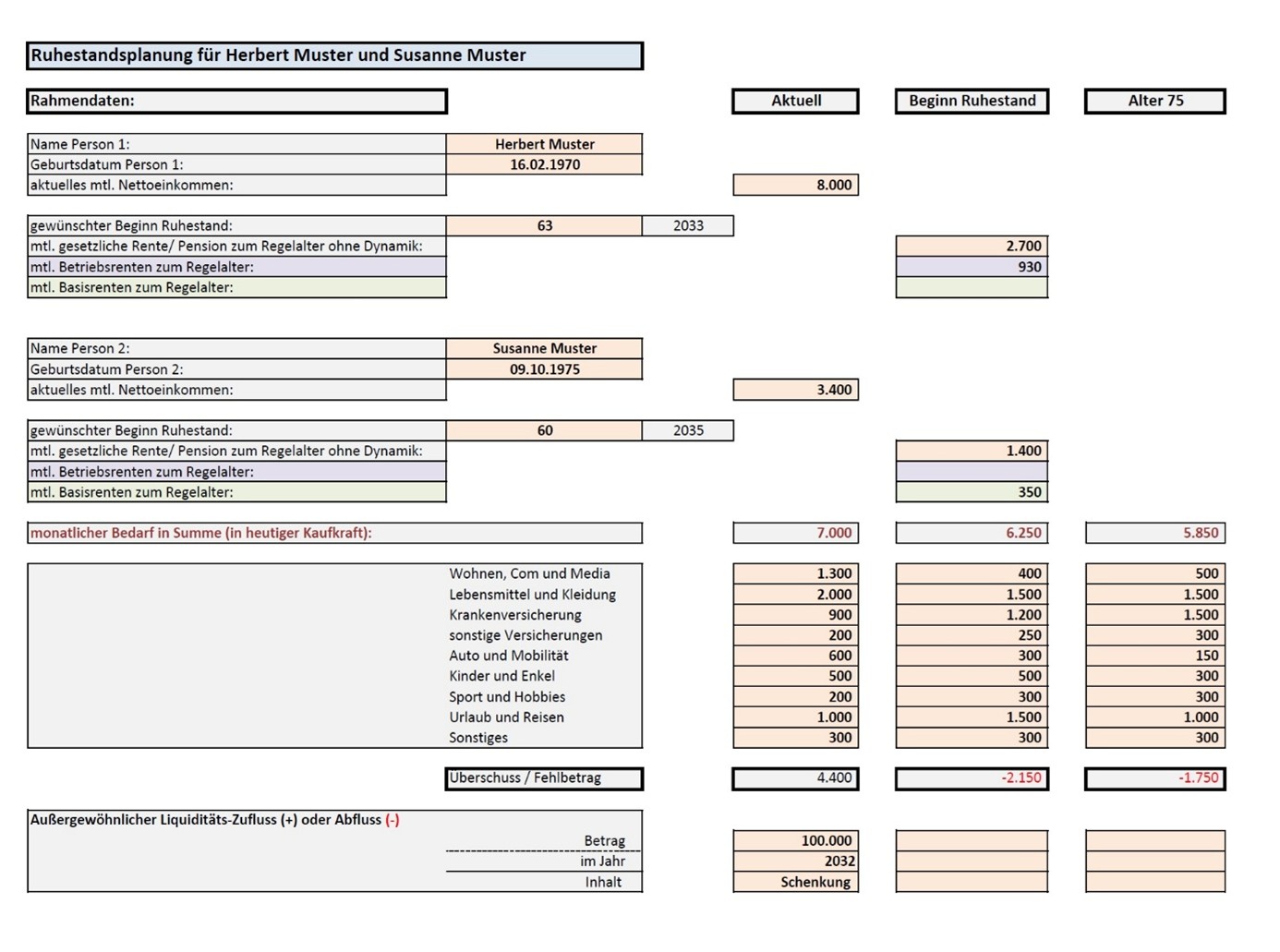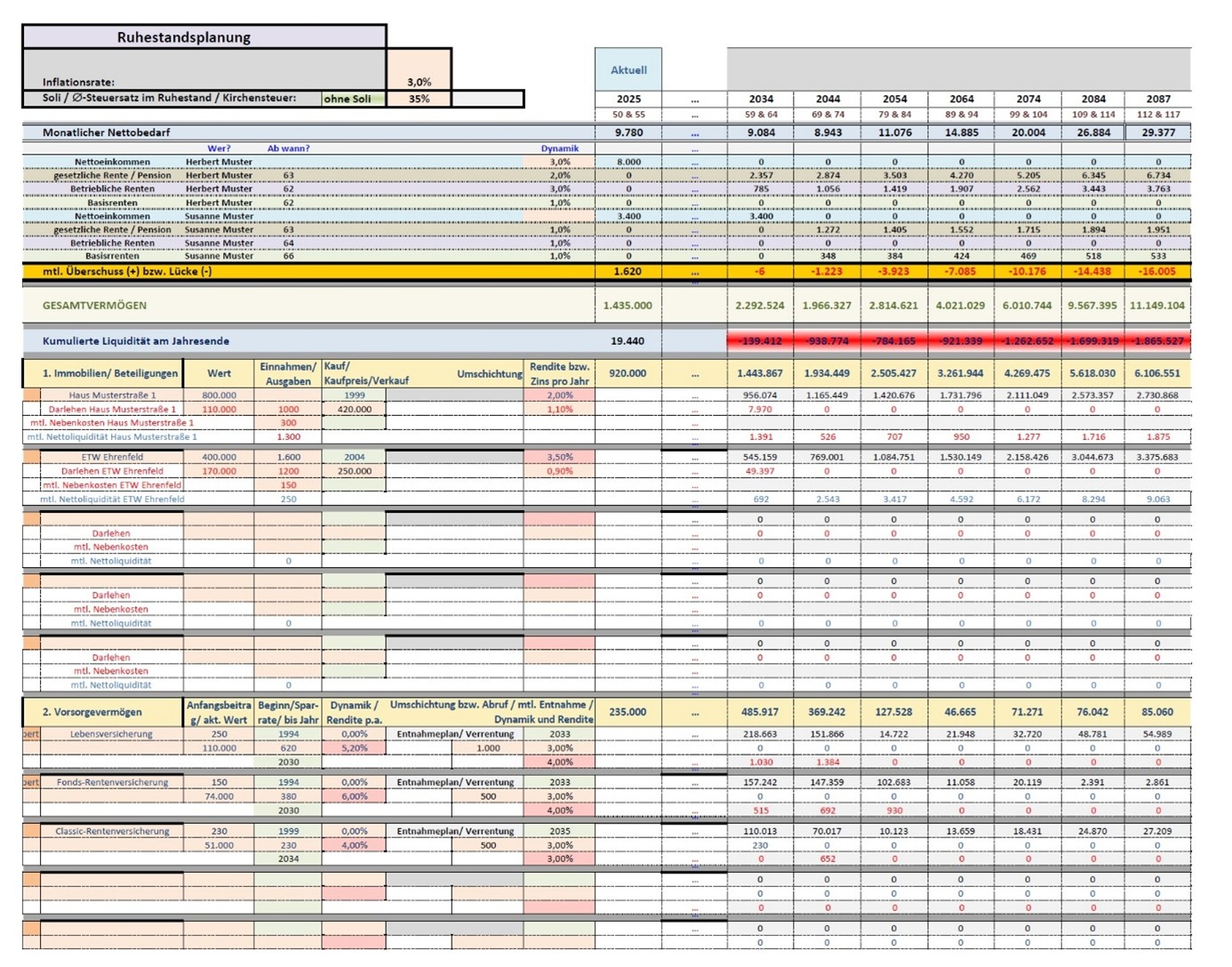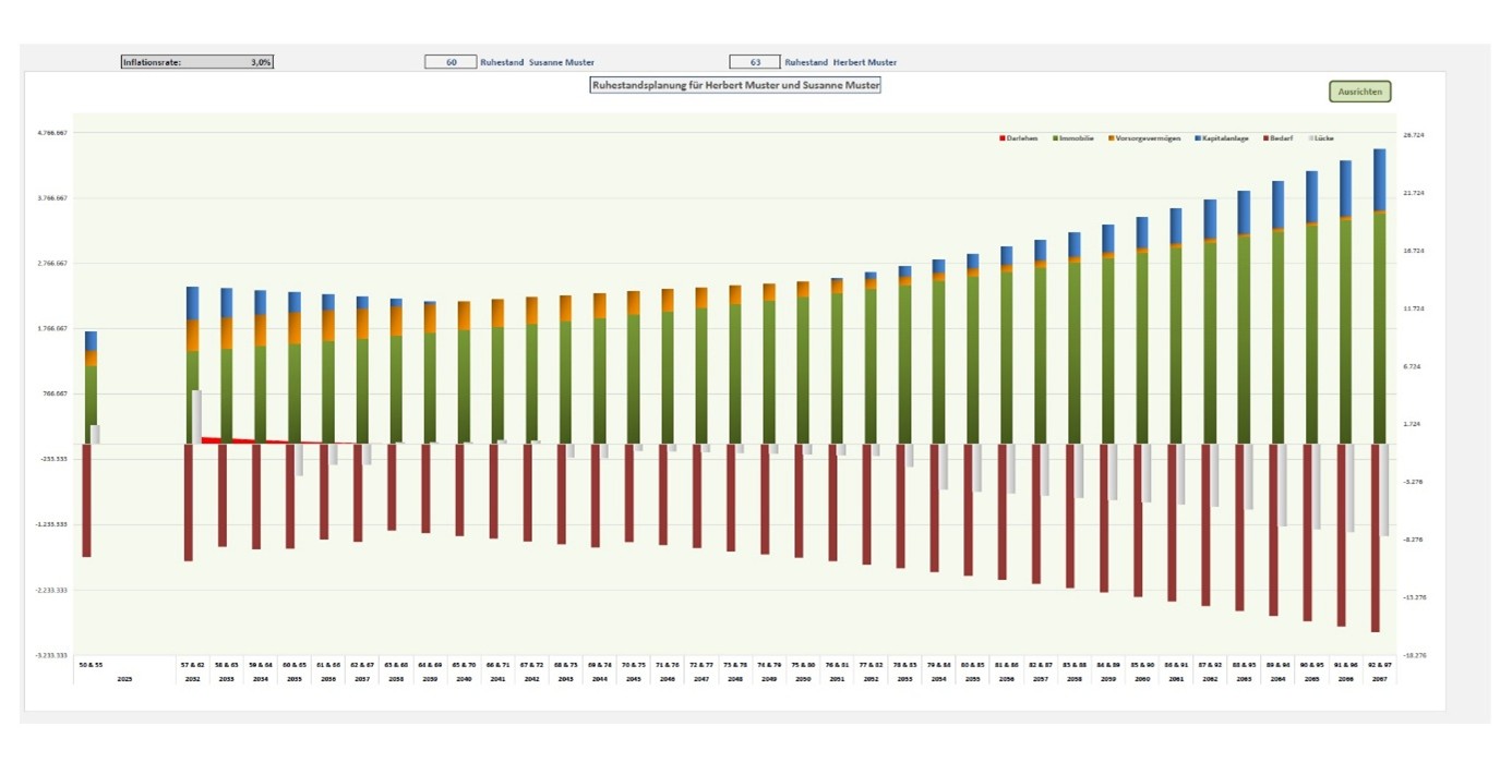 Unsere Beratung beginnt mit einer detaillierten Aufnahme der aktuellen Lebenshaltungskosten sowie der Analyse wie sich diese Ausgaben in den kommenden Jahren verändern. Im Anschluss werden die derzeitigen Vermögensverhältnisse und -strukturen festgehalten. Die Zahlen wirken zunächst beruhigend: Das Vermögen ist solide, die Renten sind zugesagt. Und doch zeigt die erste Rechnung etwas anderes: In einzelnen Jahren drohen Liquiditätslücken, weil Ausgaben schneller steigen als die gesicherten Einnahmen und weil ein Teil des Vermögens illiquide oder steuerlich ungünstig organisiert ist.