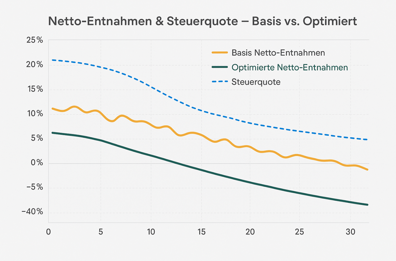Abbildung 3 – Netto Entnahmen vs. Steuerquote (Basis vs. Optimiert)