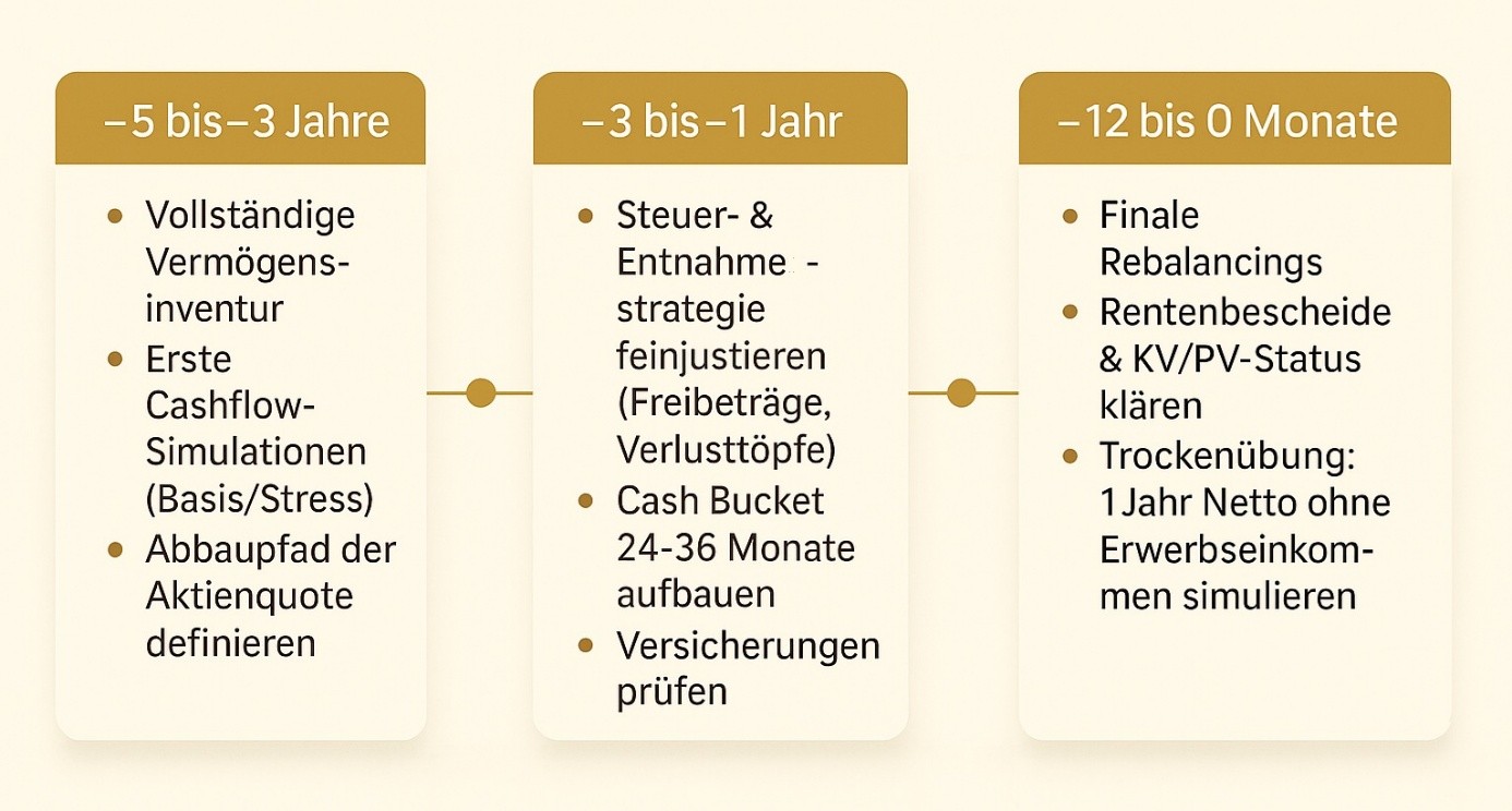 Spätestens fünf Jahre vor dem Ruhestand steht zunächst das große Aufräumen an: Welche Konten, Depots, Rentenbausteine, Immobilien und Darlehen gibt es? Welche Ausgaben sind fix, welche variabel? Aus dieser Inventur entsteht Ihr erstes, noch grobes Bild. Drei Jahre vorher wird aus dem Bild ein Entwurf: Sie definieren die Entnahmereihenfolge, prüfen Freibeträge und Verlusttöpfe, bauen einen Cash Bucket für 24 bis 36 Monate auf und testen, wie stabil Ihr Plan auf verschiedene Szenarien reagiert. Im letzten Jahr folgt die Generalprobe: ein Rebalancing auf die Zielstruktur, die Klärung von Renten und Versicherungsfragen – und ein Trockenlauf, in dem Sie schon einmal ein Jahr lang mit Null Erwerbseinkommen rechnen. Wenn dann die ersten Rentenbescheide kommen, wird aus dem Entwurf der Startplan.